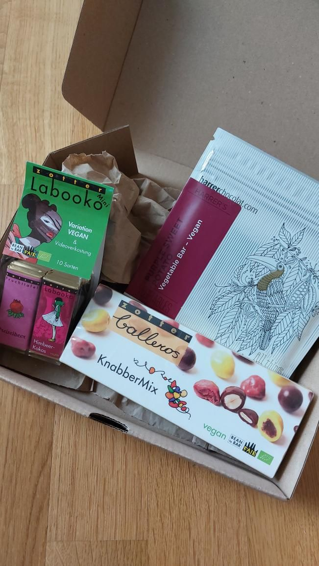 Vegan chocolate variety with funky flavours - Karuna vegan white chocolate with raspberries - Zotter 10 vegan mini bars - Zotter vegan dragée mix (Items may vary depending on available stock)