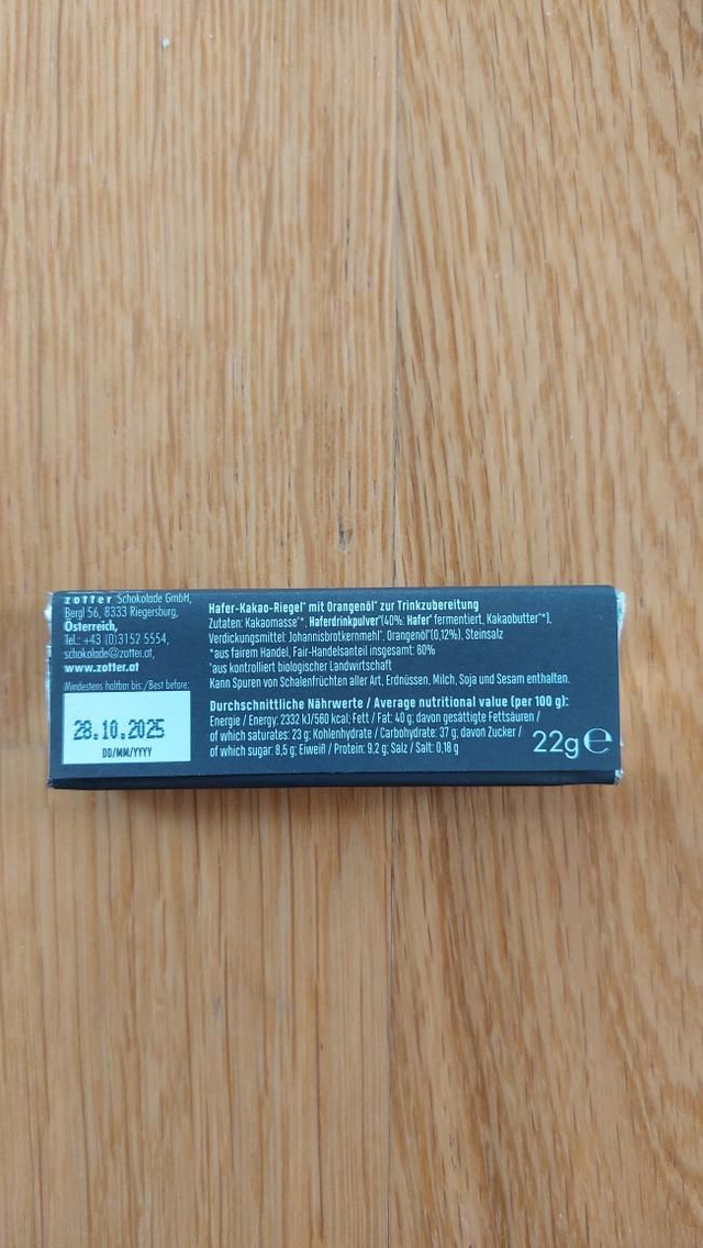 Ingredients: organic cocoa mass, organic oat drink (40% fermented oats), organic cocoa butter, organic locust bean gum, orange oil (0,12%), rock salt